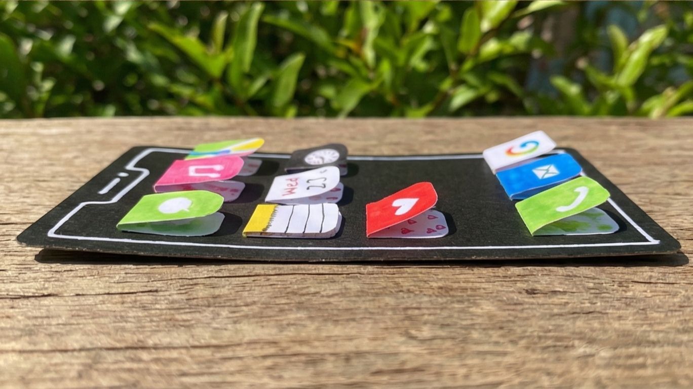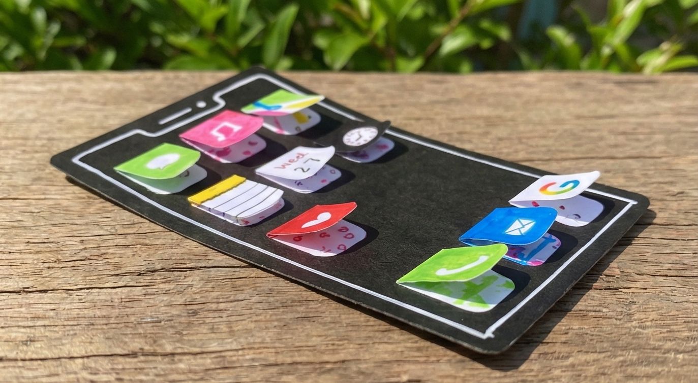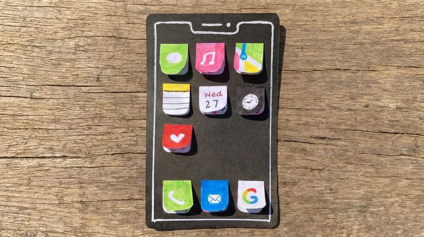 - Icons: Hand-cut and colored paper flaps (Music, Maps, Calendar, etc.) attached with precision to flip open.