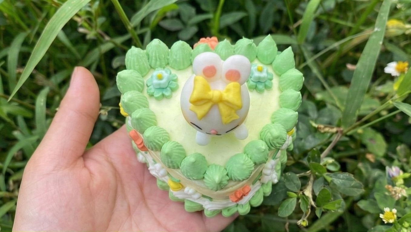 Bring a touch of eternal spring to your desk with this enchanting heart-shaped cake box! Resting in a lush meadow of piped green frosting and tiny yellow blooms, this fluffy white kitty (wearing her favorite sunny bow) is ready to guard your treasures. The unique heart shape makes this piece extra special, perfect for storing jewelry, love notes, or small keepsakes.