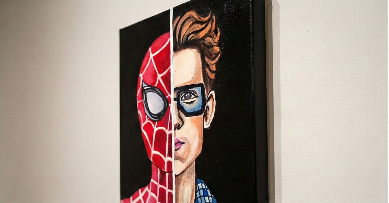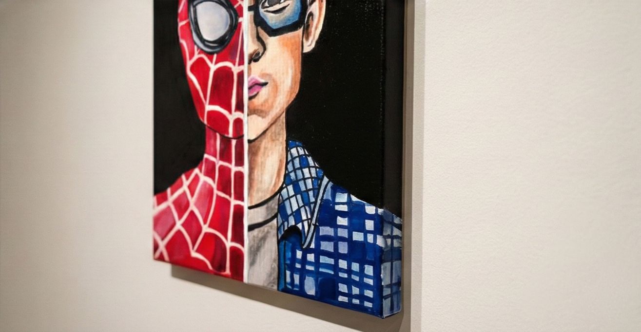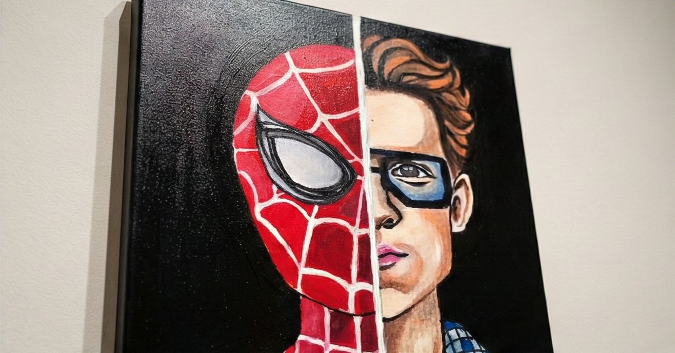 Capture the struggle and the glory of the hero's double life with this striking hand-painted canvas. One half features the iconic, webbed mask of Spider-Man, while the other reveals the human side of Peter Parker inspired by the Tom Holland portrayal), complete with his signature glasses and plaid shirt. This piece explores the contrast between the confident superhero and the thoughtful student behind the mask, a perfect statement piece for any Marvel fan's collection